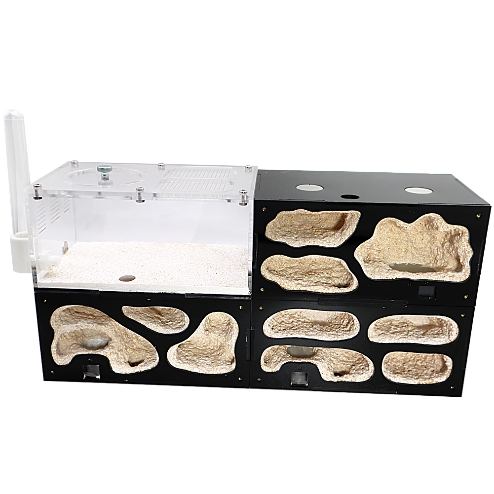 Onze mierenkolonie biedt verschillende modules, zoals voedselkamers, broedkamers en opslagruimtes. Deze modulaire opzet bootst de natuurlijke omgeving van mierenkolonies na, waardoor ze hun typische gedrag kunnen vertonen.